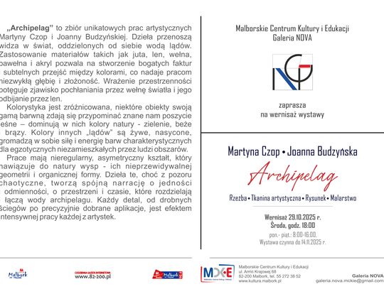Jest to zbiór unikatowych prac Martyny Czop i Joanny Budzyńskiej – artystyczna podróż po świecie wysp, które łączą i dzielą przestrzeń. Naturalne materiały, bogactwo faktur i zróżnicowana kolorystyka tworzą opowieść o jedności w różnorodności oraz o subtelnym dialogu między naturą a wyobraźnią.