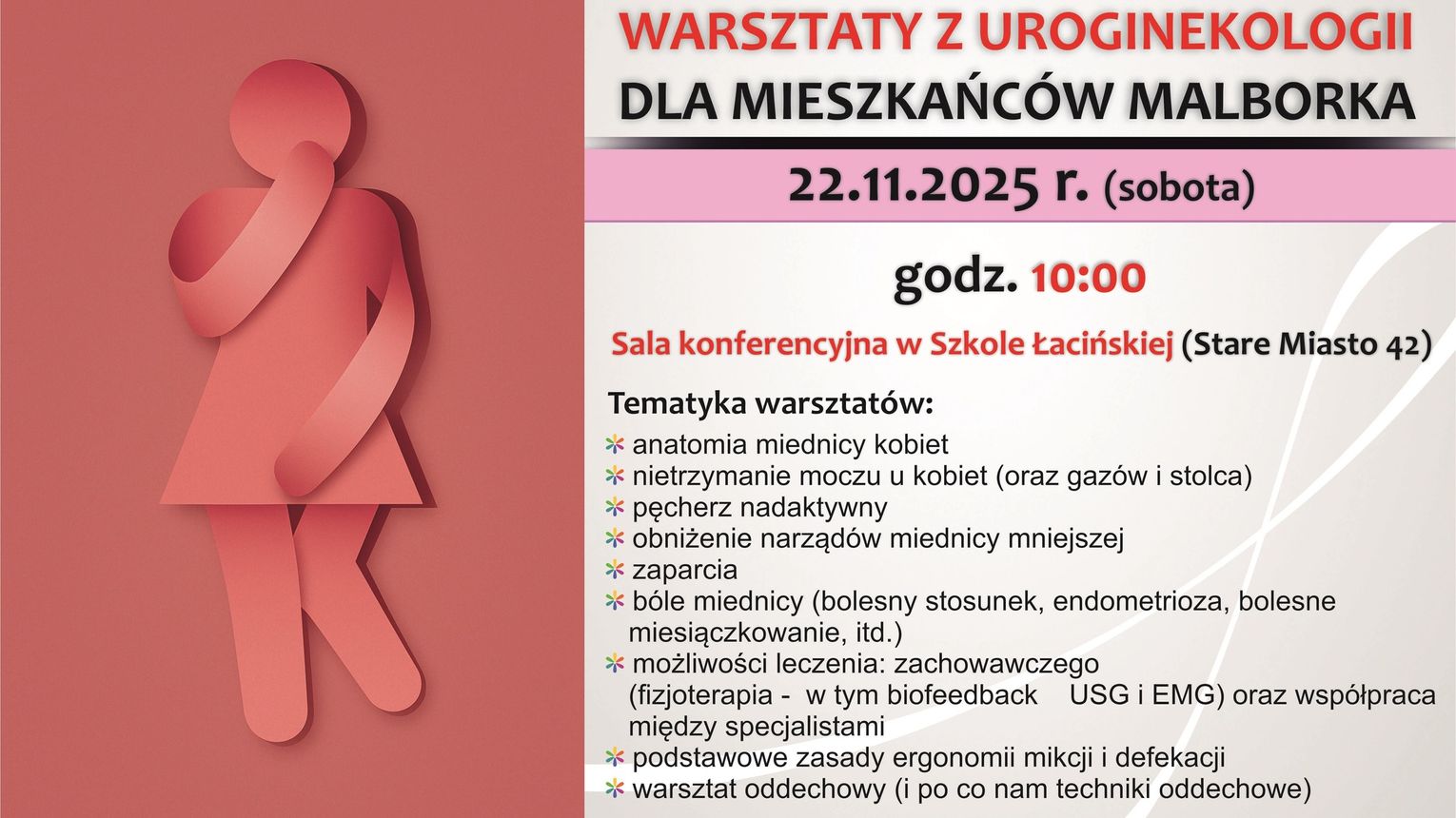 Podczas warsztatów uczestniczki zdobędą praktyczną wiedzę na temat funkcjonowania miednicy, profilaktyki dolegliwości uroginekologicznych oraz nauczą się prostych technik, które mogą poprawić komfort życia na co dzień. Zajęcia poprowadzi mgr Katarzyna Lutomirska, fizjoterapeutka uroginekologiczna z gabinetu Fizjoterapia Lutomirscy.