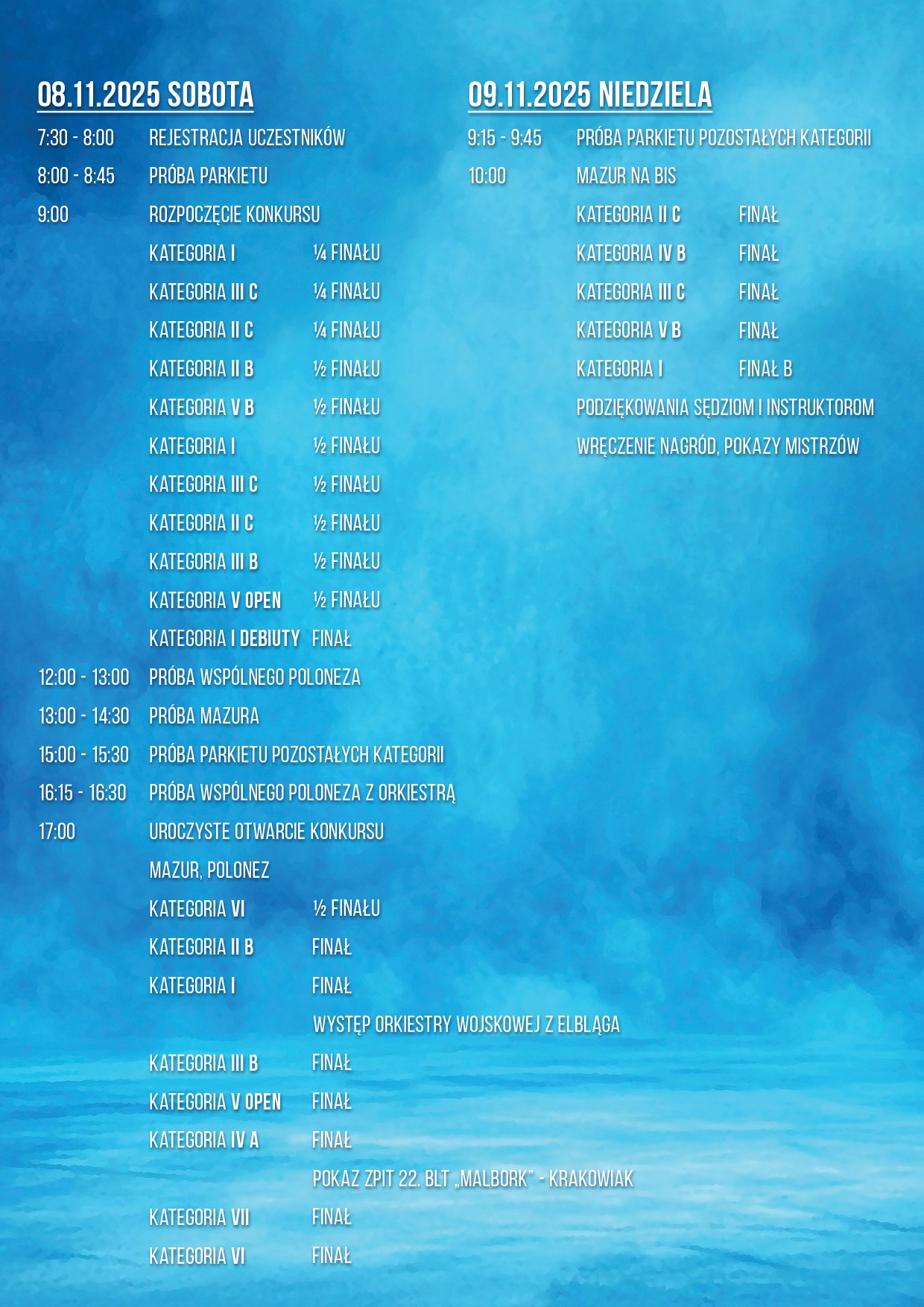 W tym roku uczestnicy rozpoczną zmagania w sobotę, 8 listopada. Rejestracja i próby parkietu potrwają od 7.30, a o godz. 9.00 nastąpi oficjalne rozpoczęcie konkursu. W pierwszej części dnia rozegrane zostaną ćwierćfinały i półfinały w niższych kategoriach wiekowych, a także finały kategorii I i debiutów. O godz. 17.00 zaplanowano uroczyste otwarcie konkursu z udziałem orkiestry wojskowej, a następnie widowiskowy polonez. Wieczorem publiczność zobaczy występ Orkiestry Wojskowej z Elbląga i pokaz Zespołu Pieśni i Tańca „Malbork”, który zaprezentuje krakowiaka.