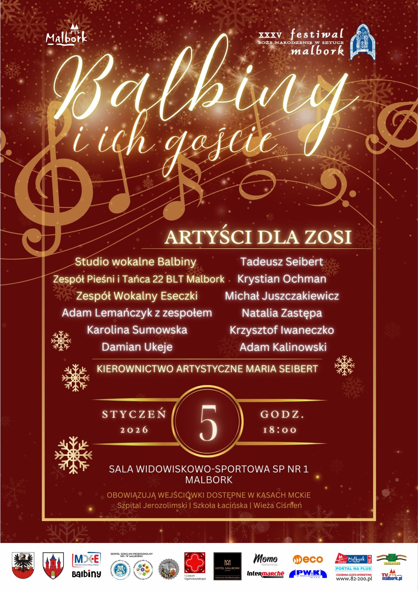 Koncert odbędzie się 5 stycznia 2026 roku o godz. 18:00 w Sali Widowiskowo-Sportowej SP nr 1 w Malborku. Na scenie wystąpią Studio Wokalne Balbiny, Zespół Wokalny Eseczki oraz Zespół Pieśni i Tańca „Malbork”. Dołączą do nich artyści znani z ogólnopolskich scen i programów muzycznych: Krystian Ochman, Damian Ukeje, Adam Kalinowski, Natalia Zastępa, Karolina Sumowska, Tadeusz Seibert, Michał Juszczakiewicz, Adam Lemańczyk z zespołem oraz Krzysztof Iwaneczko.