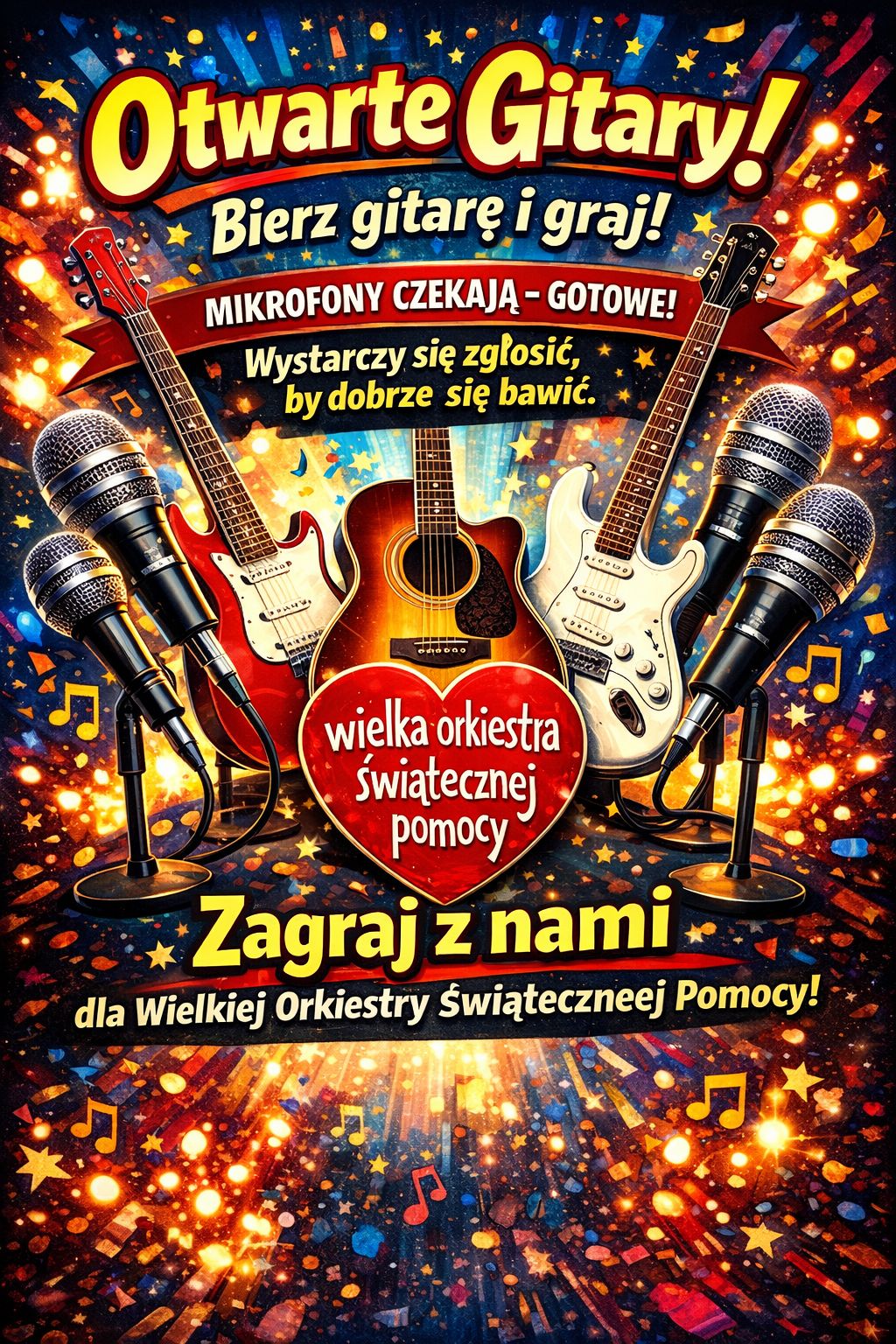 Otwarte Gitary to inicjatywa doskonale znana lokalnej społeczności. Od lat łączy ludzi, dla których wspólne spotkania przy muzyce są ważniejsze niż scena, światła i perfekcyjne wykonania. Także w tym roku jej twórcy postanowili dołączyć do finału Wielkiej Orkiestry Świątecznej Pomocy, zapraszając do wspólnego grania i pomagania.