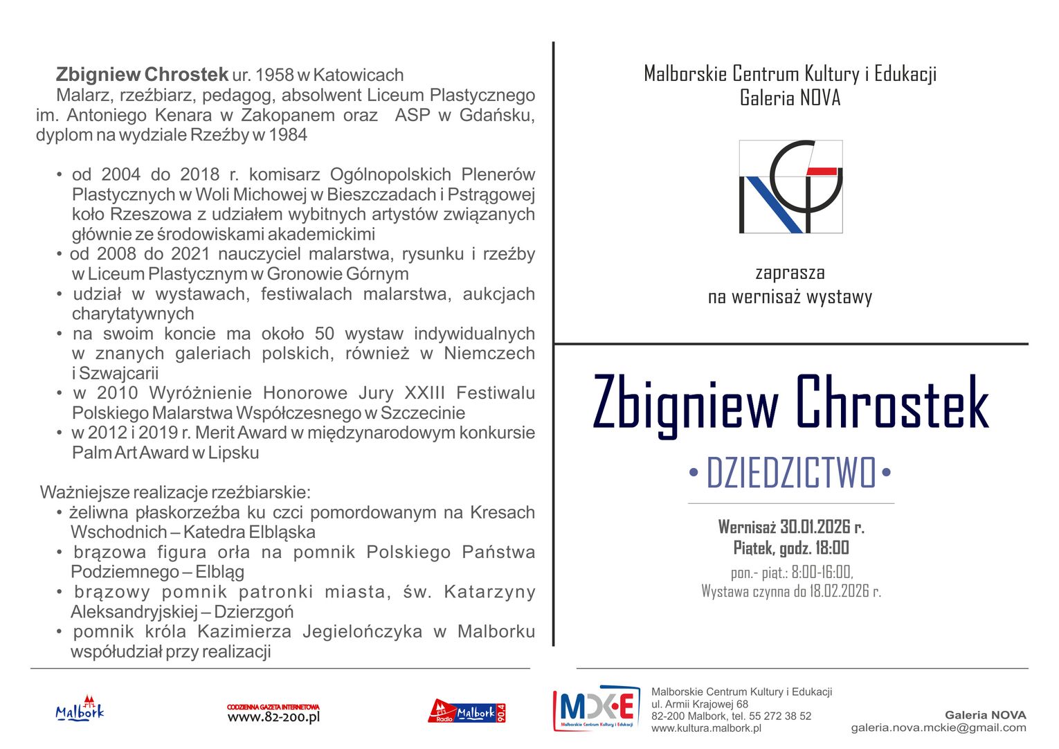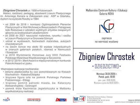 Malborskie Centrum Kultury i Edukacji zaprasza na wernisaż wystawy malarstwa Zbigniewa Chrostka pt. „Dziedzictwo”, która otwiera cykl wernisaży w Galerii NOVA w 2026 roku. Twórczość Zbigniewa Chrostka to refleksja nad pamięcią, tożsamością i doświadczeniem – osobistym oraz kulturowym. Prezentowane prace cechuje dojrzały, rozpoznawalny język artystyczny, połączony z precyzją formy zapraszający widza do kontemplacji i dialogu z przeszłością.