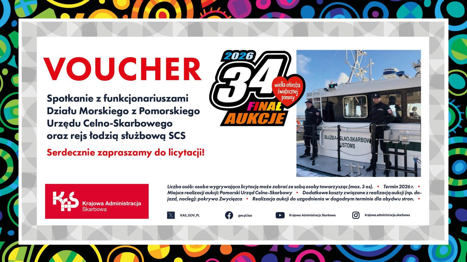 Pomorska KAS w szczególności zaprasza do licytacji wyjątkowego spotkania z funkcjonariuszami Służby Celno-Skarbowej (SCS) z Działu Morskiego Pomorskiego Urzędu Celno-Skarbowego w Gdyni oraz rejs łodzią służbową SCS.
