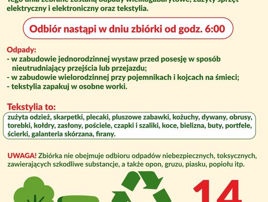 Odpady należy wystawić do godziny. 6:00 w dniu zbiórki (14 lutego 2026):