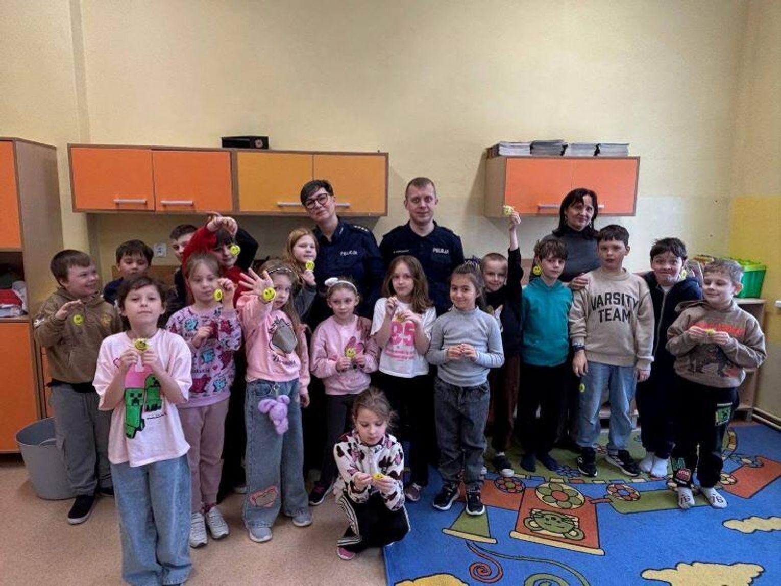 Policjanci mówili także o bezpiecznym graniu w sieci. Uczniom przypomniano, aby nie udostępniać w grach internetowych swoich danych osobowych, nie przesyłać zdjęć nieznajomym oraz nie klikać w podejrzane linki. Zwrócono uwagę na zagrożenia związane z oszustwami internetowymi, nieodpowiednimi treściami oraz kontaktami z obcymi osobami podszywającymi się pod rówieśników. Podkreślono, że w przypadku niepokojących sytuacji w sieci należy zgłosić problem rodzicom lub nauczycielom. Ważnym elementem spotkania było również bezpieczeństwo na dworze i w ruchu drogowym. Uczniowie przypomnieli sobie zasady prawidłowego przechodzenia przez jezdnię, korzystania z przejść dla pieszych oraz noszenia elementów odblaskowych. Podkreślono, jak istotna jest widoczność pieszego, zwłaszcza w okresie jesienno-zimowym.