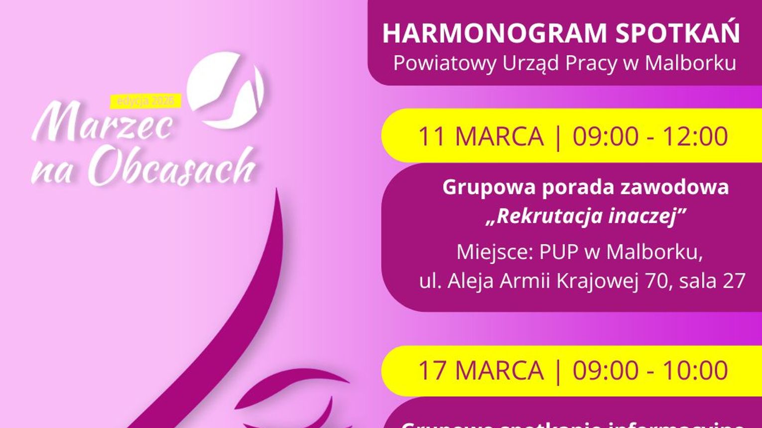 - 26 marca – Grupowa porada zawodowa „Biznes w kobiecych rękach” (al. Armii Krajowej 70, sala nr 27).