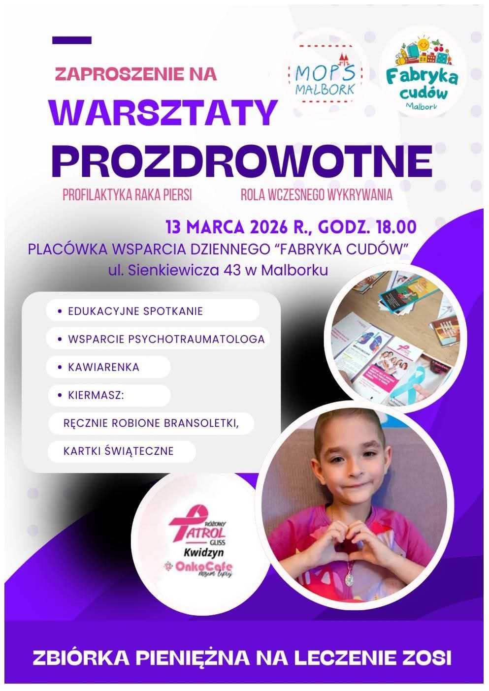 Wydarzenie odbędzie się 13 marca 2026 roku o godzinie 18:00 w Placówce Wsparcia Dziennego „Fabryka Cudów” przy ul. Sienkiewicza 43 w Malborku. Głównym tematem spotkania będzie profilaktyka raka piersi oraz uświadamianie, jak kluczową rolę odgrywa wczesne wykrywanie zmian nowotworowych. Organizatorzy przygotowali merytoryczne panele, które w przystępny sposób przybliżą zasady dbania o zdrowie.