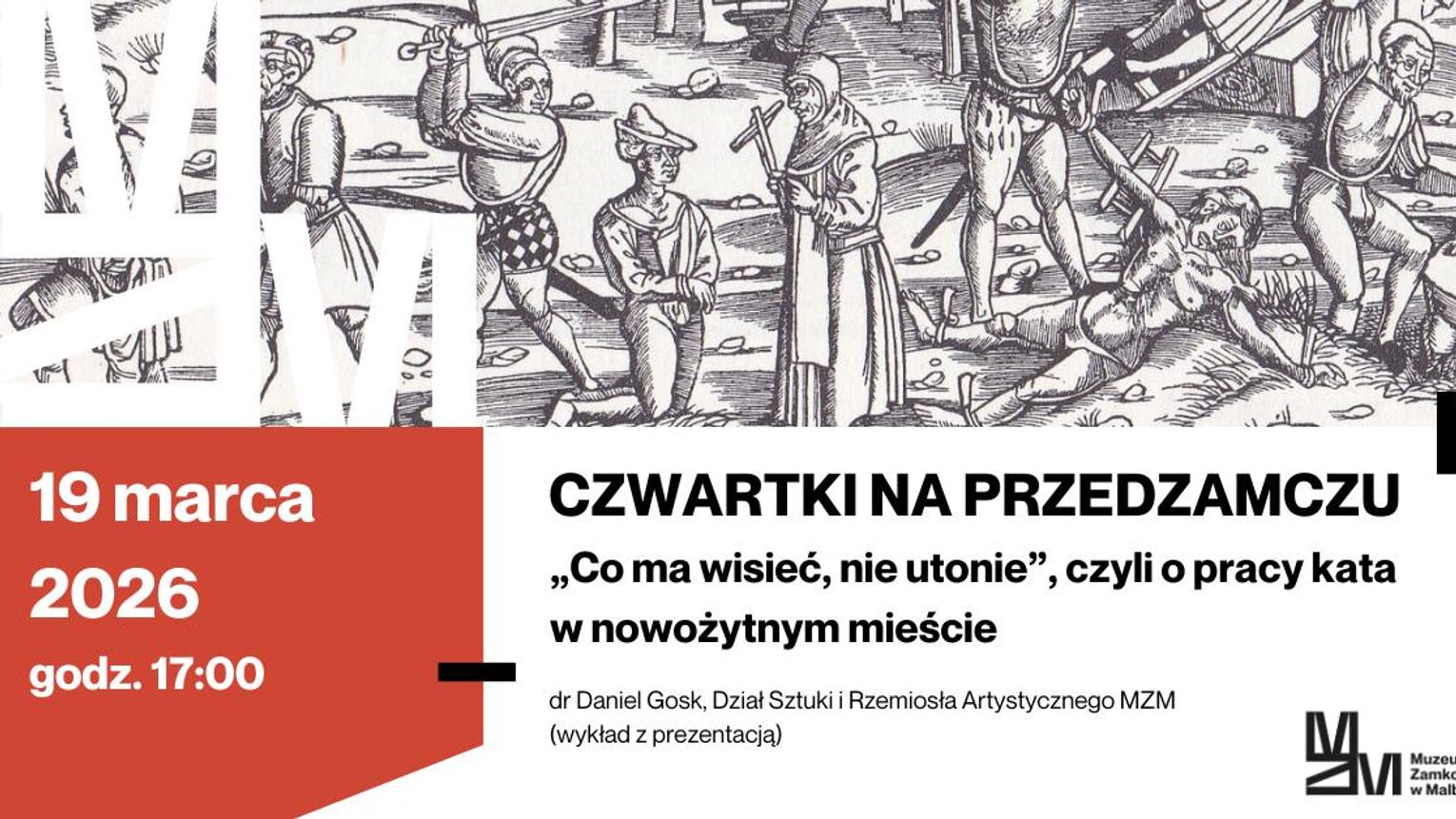 Muzeum Zamkowe w Malborku w ramach cyklu "Czwartki na Przedzamczu" zaprasza na wykład połączony z prezentacją pt. „Co ma wisieć, nie utonie”, czyli o pracy kata w nowożytnym mieście. Wydarzenie 19 marca br. o godz. 17.00 w Bibliotece zamkowej na Przedzamczu poprowadzi dr Daniel Gosk, Dział Sztuki i Rzemiosła Artystycznego MZM.