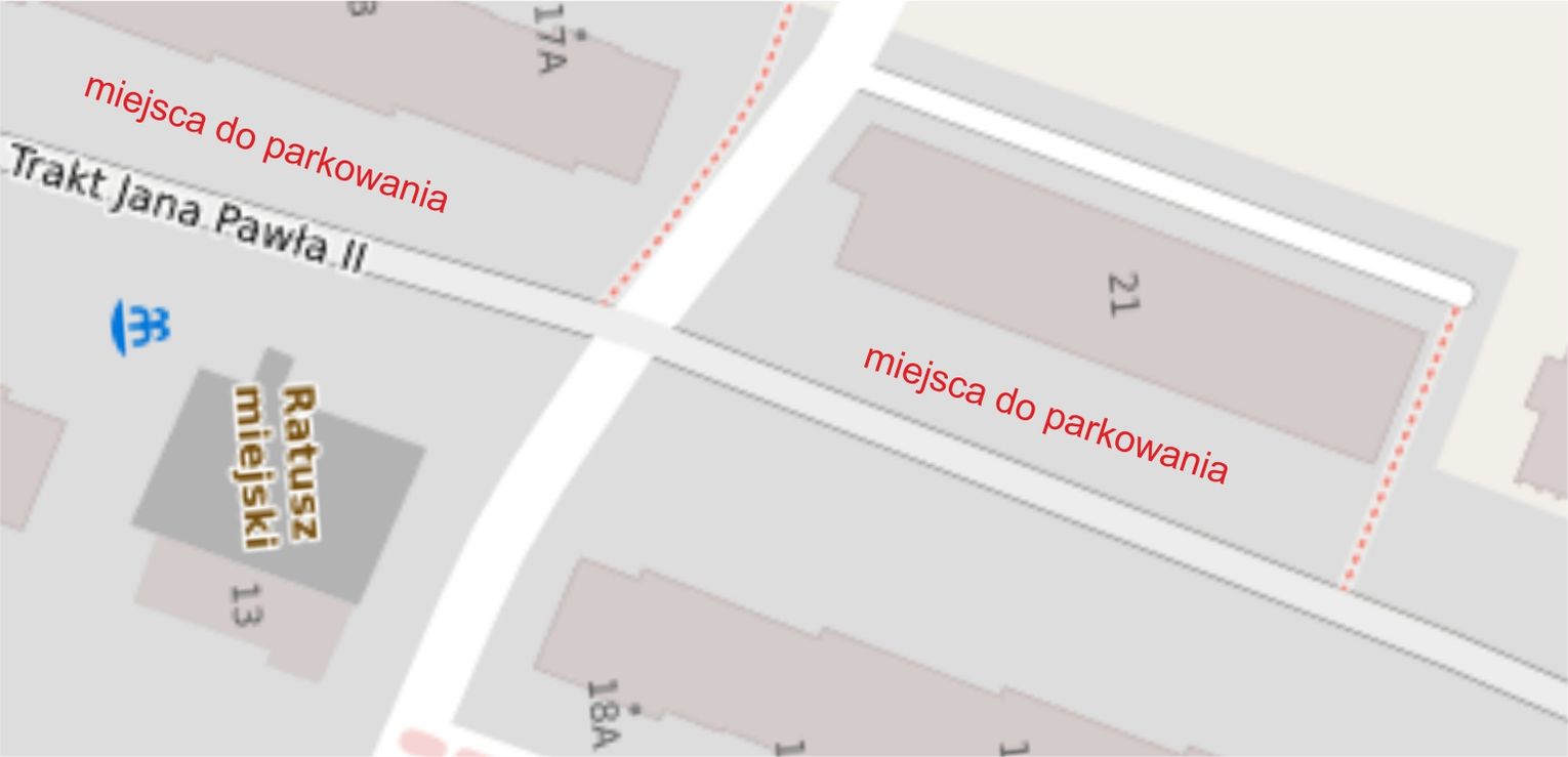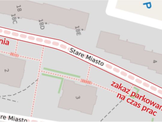 Od czerwca-lipca wzdłuż bloków 18 i 4 przy ulicy Stare Miasto nie będzie możliwości parkowania samochodów osobowych, droga dostępna będzie jedynie dla służb komunalnych oraz korzystających z garaży bloku numer 18. Parkowanie samochodów nie będzie możliwe również wzdłuż wyjazdu z ulicy Stare Miasto w kierunku placu przed kościołem pw. św. Jana Chrzciciela. Na czas remontu mieszkańcy będą mogli parkować na całym odcinku Traktu Jana Pawła (po obu jego stronach).