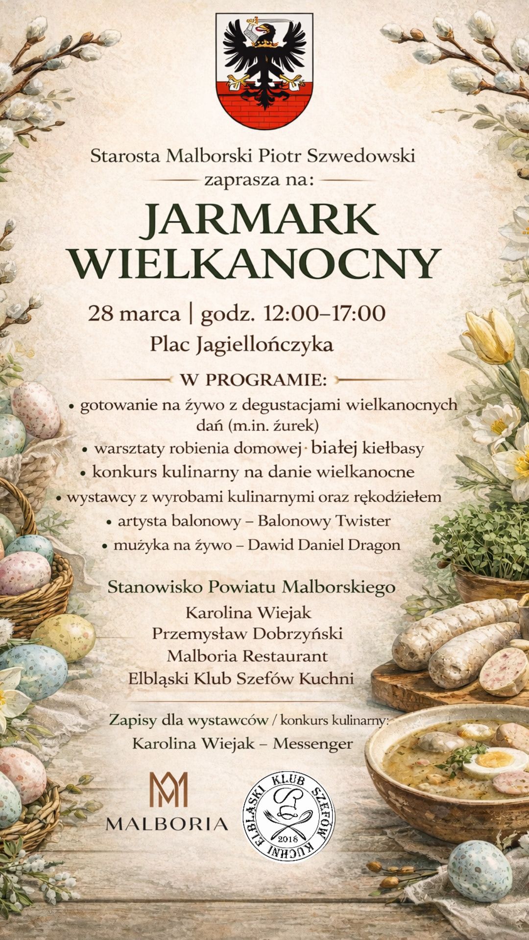 Jarmark wystartuje 28 marca (sobota) o godzinie 12:00 i potrwa do 17:00. To doskonała okazja, by zdobyć przedświąteczne inspiracje, porozmawiać z szefami kuchni i poczuć radosną nadzieję, jaką niesie nadchodząca Wielkanoc.