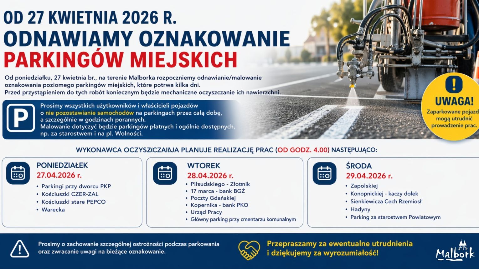 Miasto apeluje także o zachowanie szczególnej ostrożności podczas parkowania oraz zwracanie uwagi na bieżące oznakowanie i komunikaty.