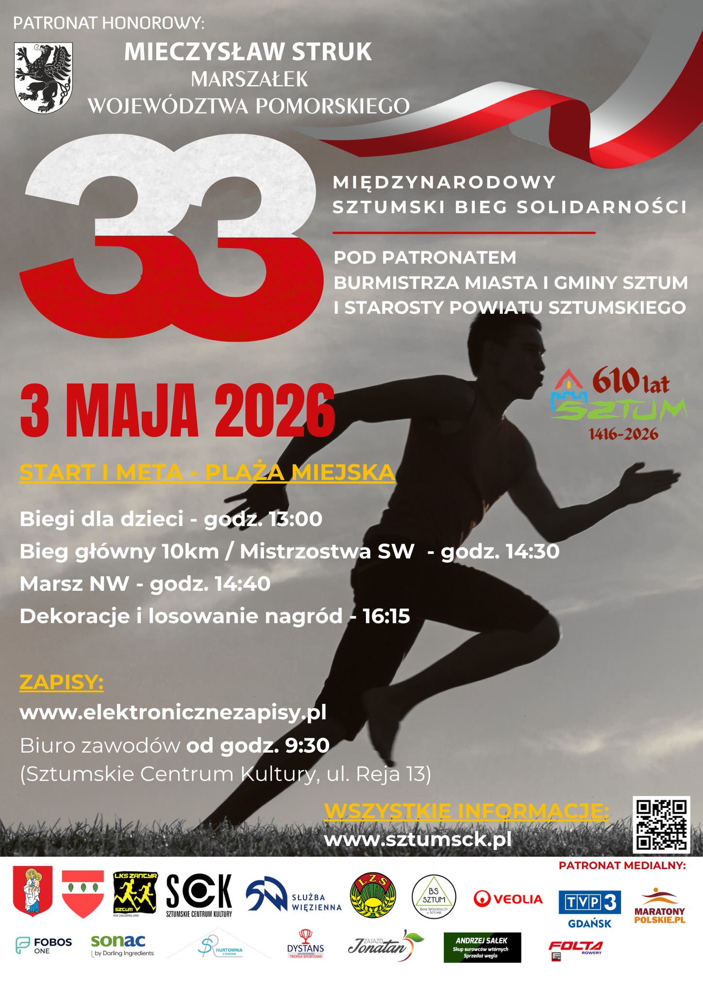 Następnie wydarzenia przeniosą się na plażę miejską, gdzie odbędzie się 33. Międzynarodowy Sztumski Bieg Solidarności. Od godz. 13:00 zaplanowano biegi dla dzieci, o 14:30 wystartuje bieg główny oraz Mistrzostwa Służby Więziennej, a o 14:40 marsz Nordic Walking.